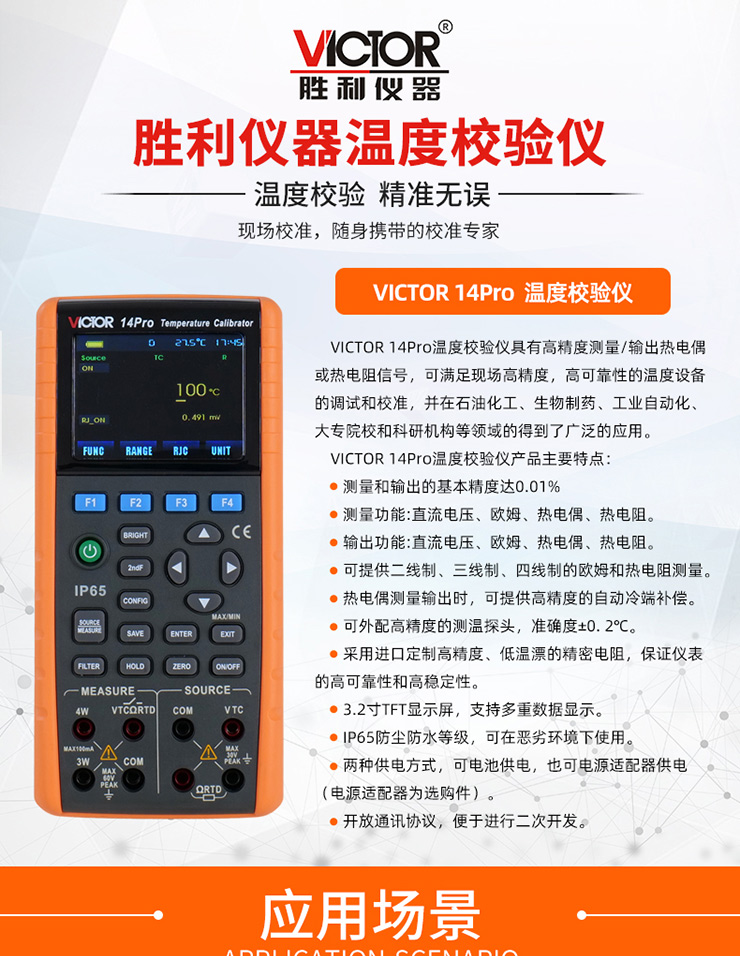 VICTOR 14Pro 溫度校驗(yàn)儀具有高精度測(cè)量/輸出熱電偶或熱電阻信號(hào),可滿足現(xiàn)場(chǎng)高精度,高可靠性的溫度設(shè)備的調(diào)試和校準(zhǔn),并在石油化工、生物制藥、工業(yè)自動(dòng)化、大專院校和科研機(jī)構(gòu)等領(lǐng)域的得到了廣泛的應(yīng)用。