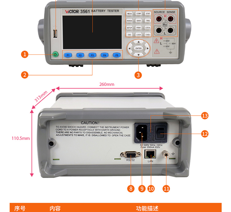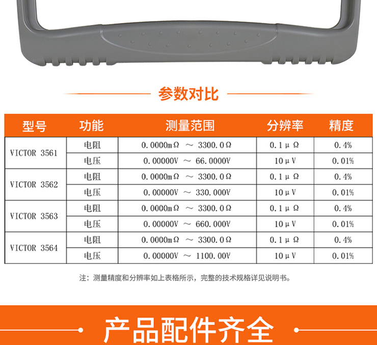 VICTOR 356X系列電池內(nèi)阻測試儀包含四個型號VICTOR 3561、VICTOR 3562、VICTOR 3563和VICTOR 3564,其測量電壓范圍分別為60V、300V、600V和1000V。測量精度和分辨率如下表格所示,完整的技術規(guī)格詳見說明書。