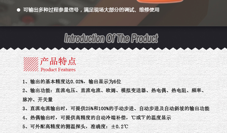 具有高精度輸出現(xiàn)場(chǎng)所需的各種過(guò)程參量,適用于現(xiàn)場(chǎng)溫度變送器、壓力變送器、DCS、PLC等系統(tǒng)的調(diào)試和校準(zhǔn),并在石油化工、生物制藥、工業(yè)自動(dòng)化、大專(zhuān)院校和科研機(jī)構(gòu)等領(lǐng)域的得到了廣泛的應(yīng)用。