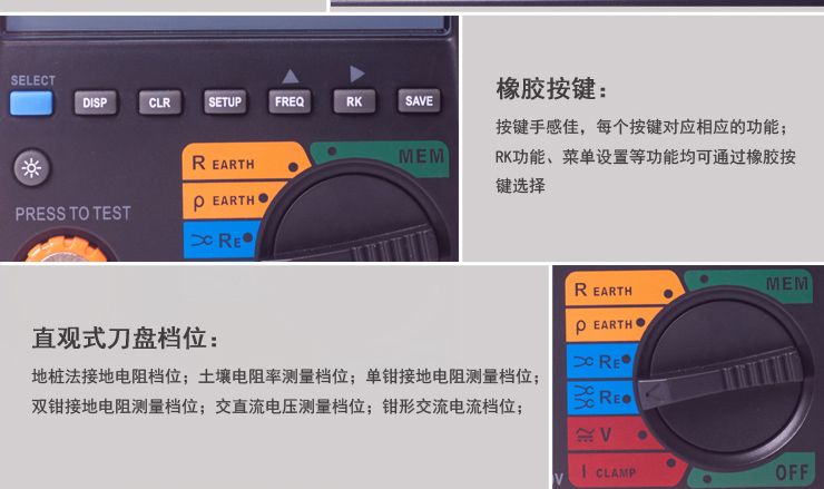 ①地樁法:采用傳統(tǒng)的打地樁方式來測量接地電阻,可以選擇2極法、3極法、4極法測量;可以測量土壤電阻率。