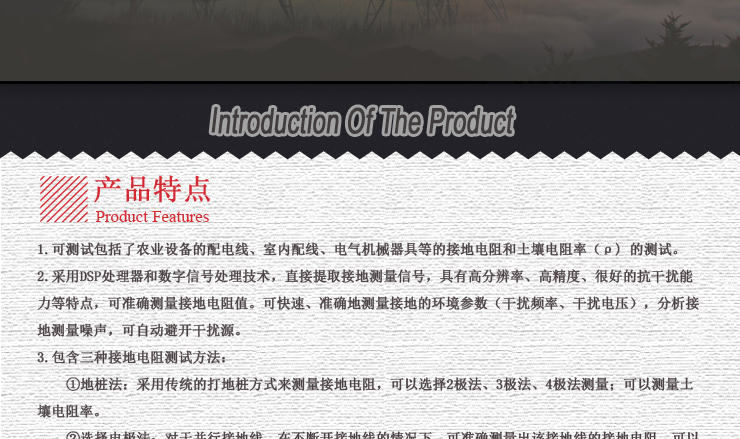 l 可測試包括了農(nóng)業(yè)設(shè)備的配電線、室內(nèi)配線、電氣機械器具等的接地電阻和土壤電阻率(ρ) 的測試。