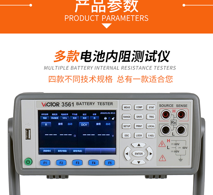 VICTOR 356X系列電池內(nèi)阻測試儀包含四個型號VICTOR 3561、VICTOR 3562、VICTOR 3563和VICTOR 3564,其測量電壓范圍分別為60V、300V、600V和1000V。測量精度和分辨率如下表格所示,完整的技術規(guī)格詳見說明書。